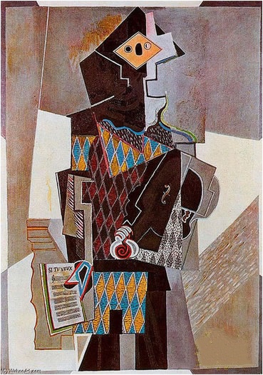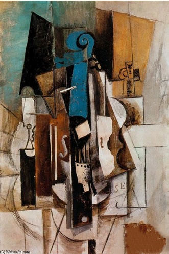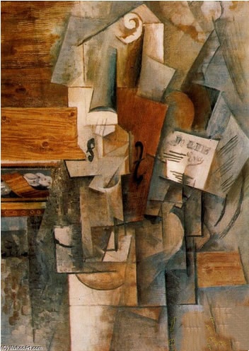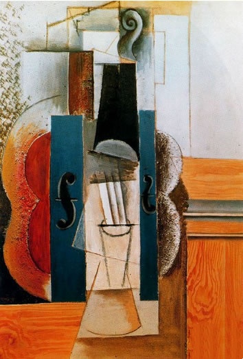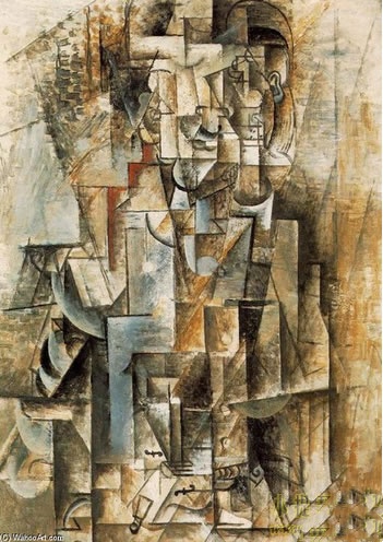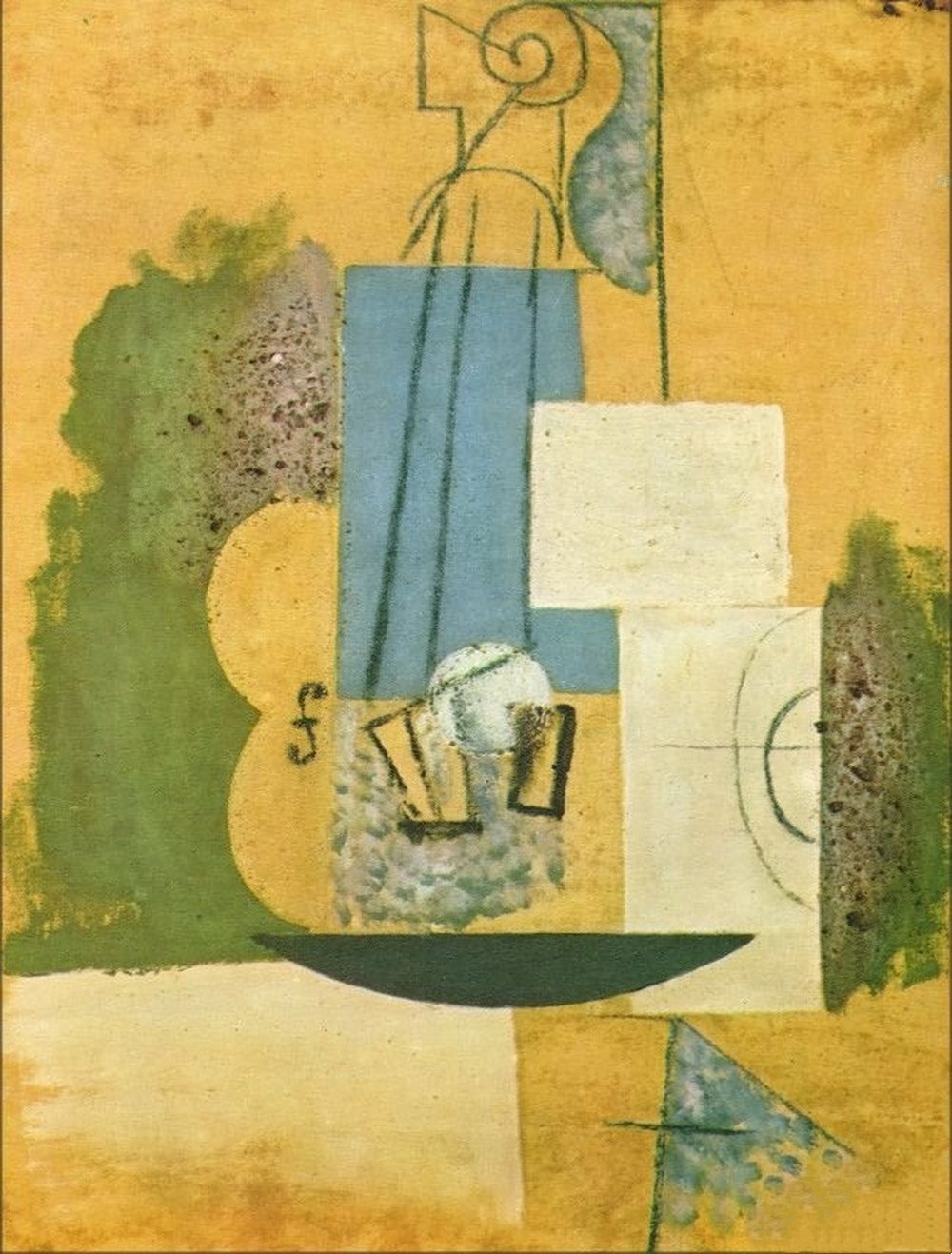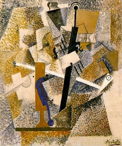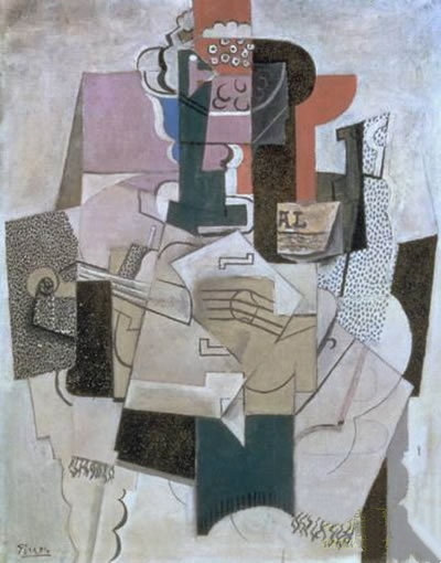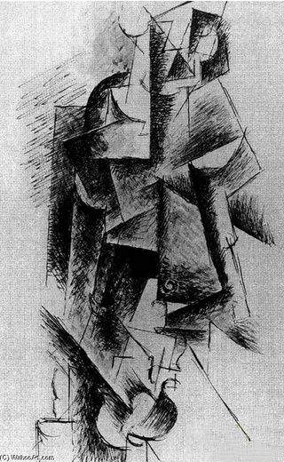 1907至1916年,毕加索进入了立体主义时期。他对于几何图形更感兴趣,尝试用半抽象艺术形式来取代光色分析。这一时期的特点是,将表现具象的物体本身和表现抽象的结构形态综合起来。为了更仔细分解造形,毕加索倾向选择较单纯的主题来作画,如静物、人体等。