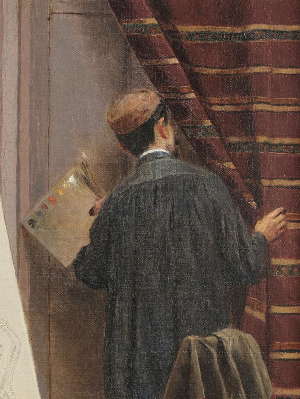 评述:画家正在进行的工作,被不合时宜地打断了,他站在门口,从门缝里查看看来人是谁。模特是一个黑发女孩,尴尬地躲在画架和窗帘后面。女孩的衣服放在旁边的椅子上,画架上刚刚描绘出轮廓,显示这是一副人体。