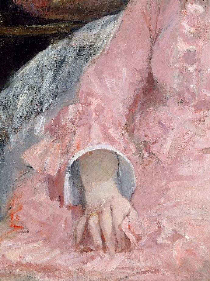 她描绘了一位静坐沙发的年轻女子,粉裙如云。
