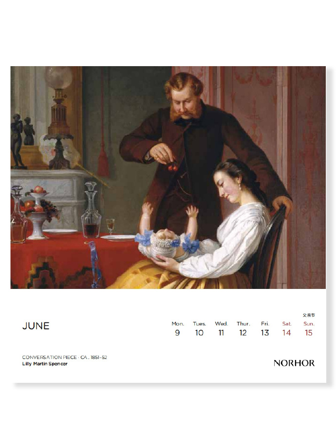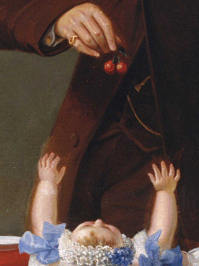 在这幅绘于1851年的油画中,母亲坐在画面中间,温柔地抱着孩子,父亲俯身,唇角含笑,拿着手中的红樱桃逗弄。在穿越时光之后,她的画作依然唤起人们对家庭温情与生活之美的共鸣——其艺术价值与历史意义,已在当代艺术史中获得应有的辉煌地位。