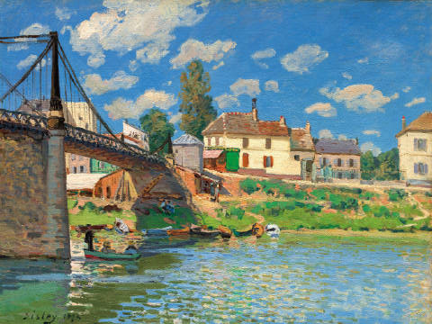 西斯莱摒弃传统风景画的细腻描摹,以松散的笔触和色块堆砌物象。例如,近观水面可见跳跃的色点,远观则形成统一的波光效果,体现了印象派对“视觉真实”的追求。
