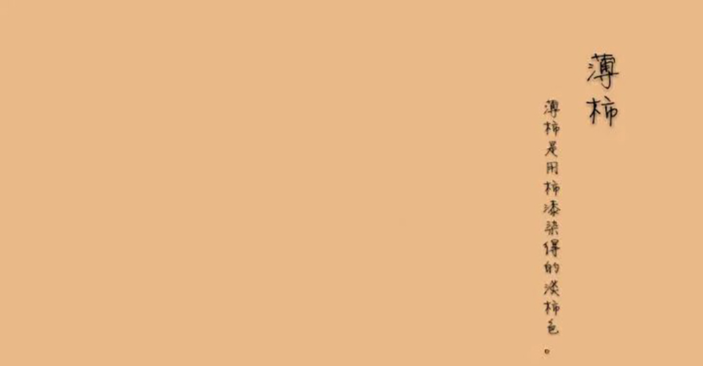 薄柿是用柿漆染得的淡柿色。白居易在《杭州春望》中写到红袖织绫夸柿蒂,青旗沽酒趁梨花。薄柿色就像是尚未成熟垂挂于枝头的柿,正等着谁家巧织女素手采摘做染料。