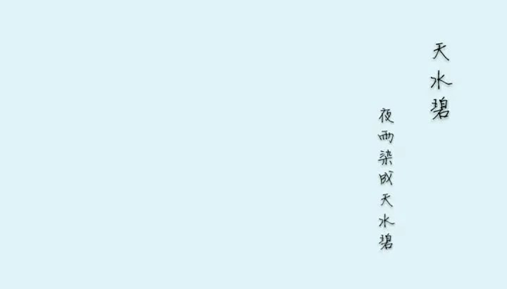 天水碧,浅青色。古代丝帛染色名。相传为南唐后主李煜的姬妾所染。天水碧,染就一江秋色,螯戴雪山龙起蛰,快风吹海立,数点烟鬟青滴,一杼霞绡红湿,白鸟明边帆影直,隔江闻夜笛。