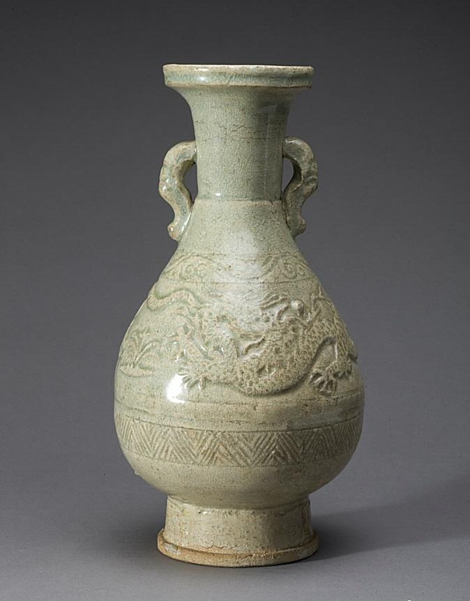 元代景德镇龙虎纹衔环青瓷瓶一对