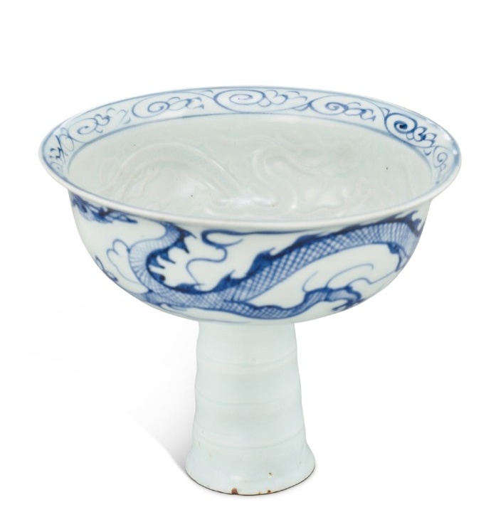 相类元代高足杯见于重要公私收藏。北京故宫博物院藏一例,收录于《故宫博物院藏文物珍品全集:青花釉里红(上)》,上海,2000年,图版12;大英博物馆亦藏一例(馆藏编号:1975,1028.4);另见两例,分别为 Otto Harriman 夫人及 英国 Cunliffe 肯里夫勋爵旧藏,展览并收录于《Chinese Blue and White Porcelain: 14th to 19th Centuries》,东方陶瓷学会,伦敦,1953-4年,编号11及12。拍卖类例可参考琼肯三世旧藏一例,先售于香港佳士得1993年10月25日,编号718,再售于香港苏富比2019年4月3日,编号106。另一例经帕默、徐氏艺术馆及玫茵堂递藏,一度售于香港苏富比2012年10月9号,编号17,后入藏十面灵璧山居。