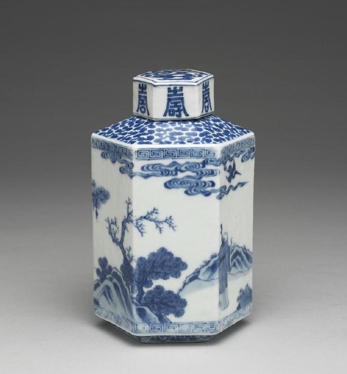 小口,短頸,斜肩,直腹,肩腹間凸棱三道呈三段竹節形,平底,凹足,帶圓狀瓶頂蓋。全器均施白釉,外壁以青花繪竹葉,肩至底共四層竹節,節與節之間各加飾小圈點一周,象徵竹節的凸點。蓋面飾花卉圖案,蓋壁紋飾與器同。器底青花書「大清康熙年製」六字二行楷款,外加雙青圈。此類型蓋罐為貯藏茶葉的茶葉罐,除青花外亦有鬥彩器,以青花鉤竹葉輪廓,高溫燒成後再施綠彩低溫燒成,相當雅緻。