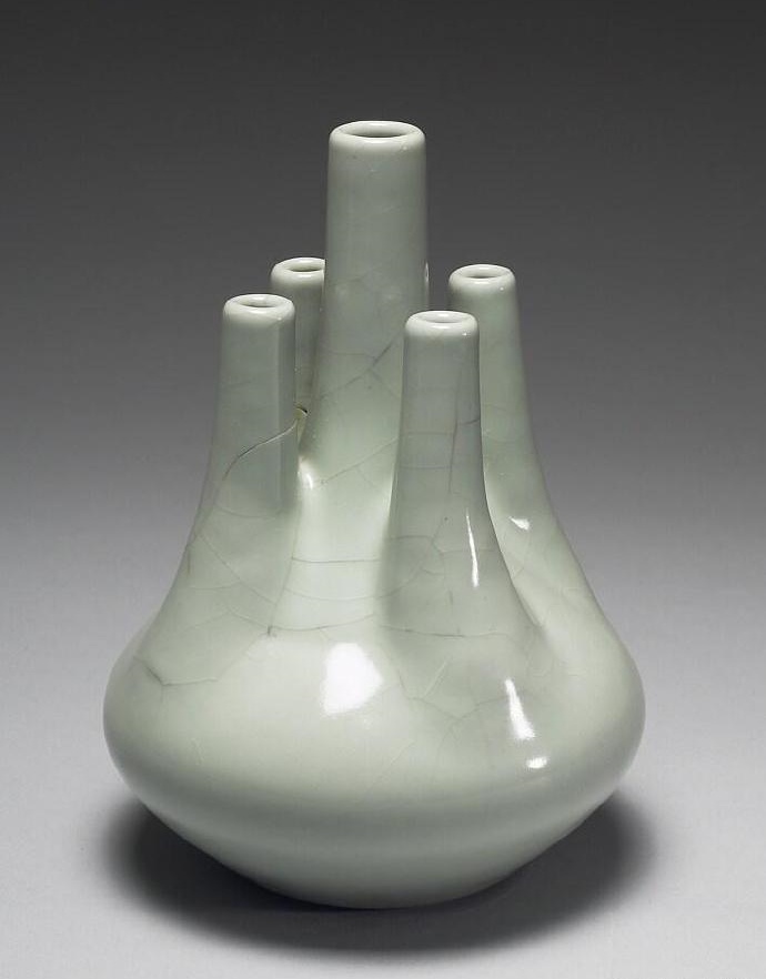 說明: 五管花插,中者較高大,各作圓口,直長頸,下接垂腹,內體相通,平底,淺圈足。通體施汝釉,色灰青,帶透明開片紋,釉面有舊傷裂。圈足露胎,塗棕色汁仿銅足,底心篆書「大清雍正年製」六字三行青花款。