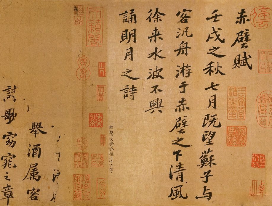 苏轼早年学“二王”,中年以后学颜真卿、杨凝式,晚年又学李北海,又广泛涉猎晋唐其他书家,形成深厚朴茂的风格。他的书法,用笔多取侧势,结体扁平稍肥。这与他握笔的姿势也很有关系,苏轼执笔为“侧卧笔”,即毛笔侧卧于虎口之间,类似于现在握钢笔的姿势,故其字右斜,扁肥。