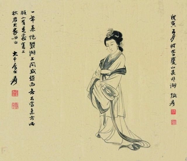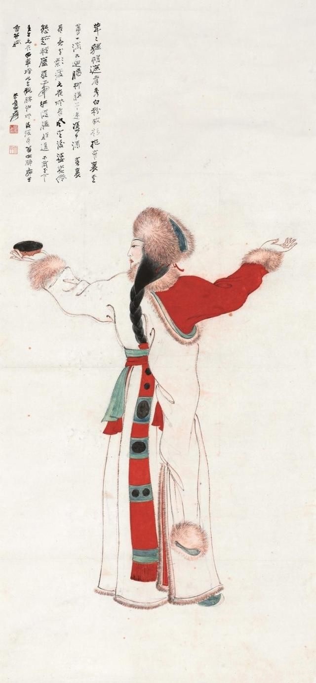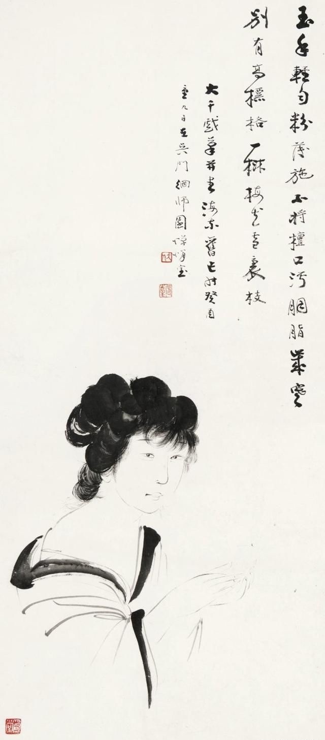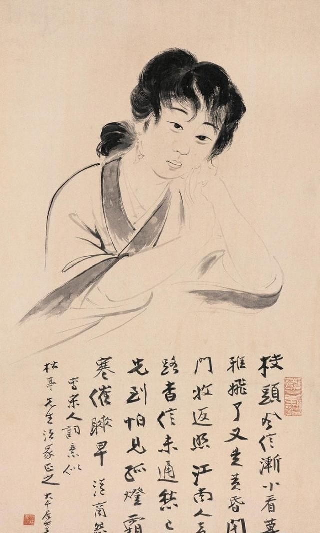 在张大千(1898—1983)的人物画里,多以画女性居多,一个重要原因是张大千认为“男人不如女人美,不如女人入画”。在他看来,这世上够得上“奇”的男人实在太少,所以他有“眼中恨少奇男子,腕底偏多美妇人”之句。他善于画美人,也懂得欣赏美人,在他的笔下既有优雅的少妇,风华绝代的仙女,也有受了惊吓的贵妃,各种类型、各种情绪美人的风情,都被他刻画得细致入微。张大千选择美人作为自己的主要描摹对象,也是为了继承和发扬中国人物画传统。当年书画大师叶恭绰曾对张大千说,“人物画一脉,自吴道子、李公麟后已成绝响,仇实父失之软媚、陈老莲失之诡谲,有清三百年,更无一人焉 ”,力劝他放弃花卉山水,专攻人物。张大千之所以西去敦煌临摹魏、隋、唐、宋各代壁画,想必与朋友的建议和个人的追求不无关系。