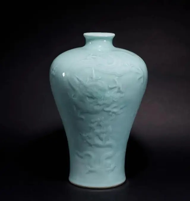 清乾隆 粉青釉雕海水龙纹梅瓶