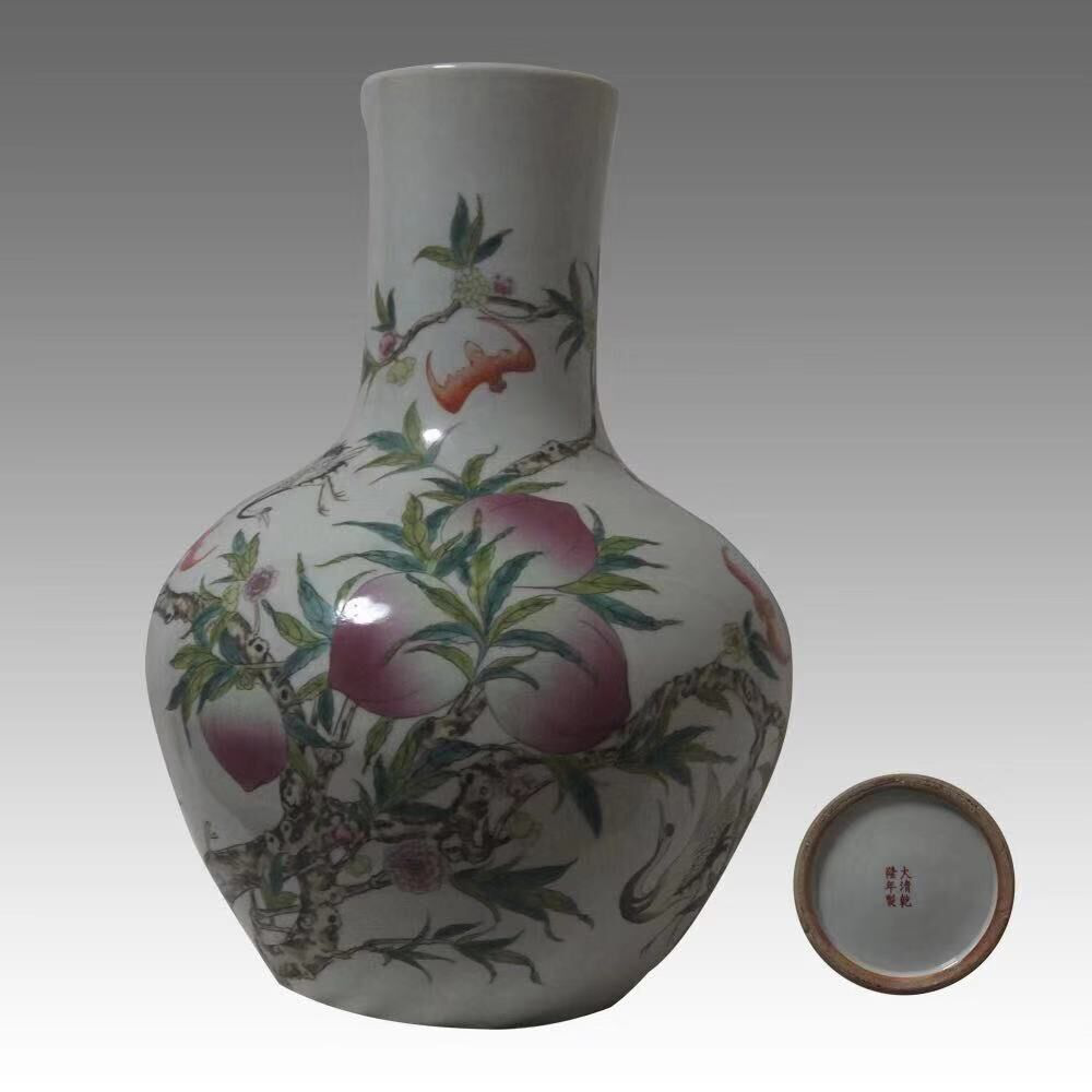 粉彩九桃五蝠天球瓶: