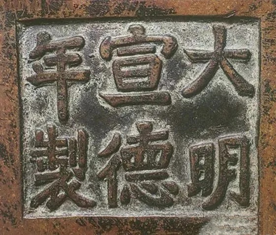 一 官款:宣德炉的官款,一般称之为“国朝款”,包括明朝永乐、宣德、正德、成化、崇祯,清朝康熙、雍正、乾隆各朝款识。常见为“大明XX年制”、“大清XX年制”的六字款,或"XX年制"四字款。如:大清宣统年制;大明成化年制;宣统年制;崇祯辛末年制;大明隆庆年制;大明崇祯年制;乾隆年制;康熙六十年制;大明正德年制(正德年没有御制,此款是官制,还是年份款不详);康熙辛亥庚生氏。炉腹内底部施念峰制;大清乾隆元年恭制;大清乾隆年制;45有琴居用;大明宣德四年,内神宫太监掌监事臣阮安督造;大清康熙年制;崇祯八年制;崇祯;壬午冬子俊制;