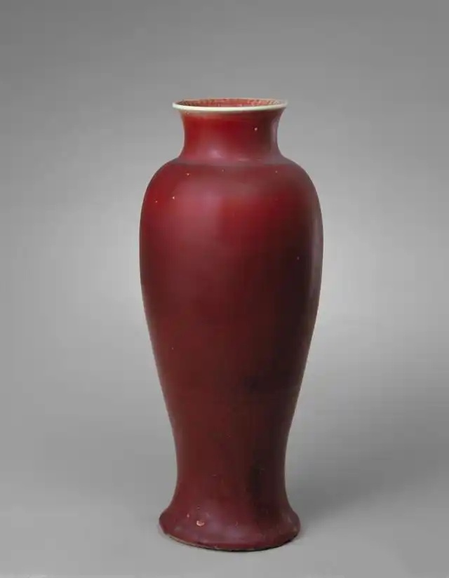 尊撇口,短颈,圆肩,长敛腹,近足处外撇,圈足。外施红釉,里口和底部施苹果绿釉。此器风格朴实,造型端庄规整,釉色红艳光亮,是康熙时郎窑红釉瓷器的典型作品。
