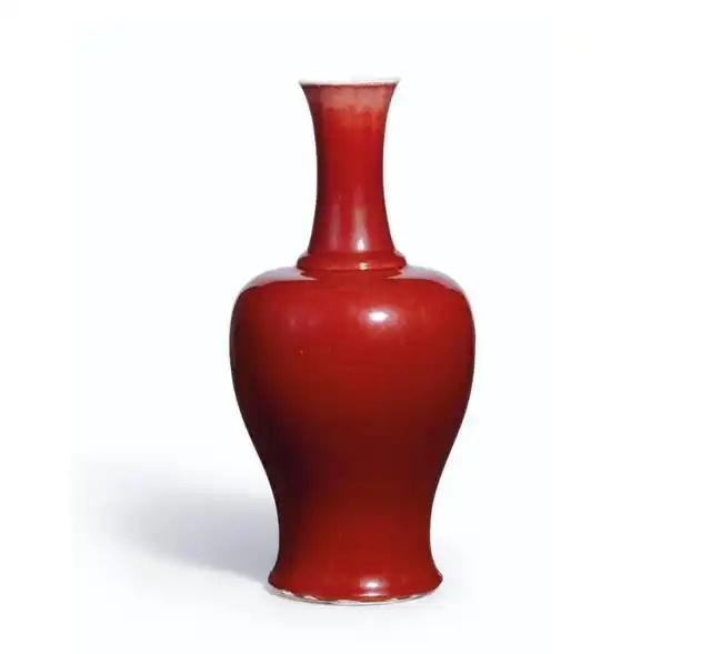本品器形,丰肩长颈,端庄秀美,不见同者。郎窰之釉,鲜若牛血,明亮光洁,为康熙朝督窰官郎廷极所创。郎廷极其人,鞠躬尽瘁,竭心製瓷,精研配釉之法,大开新巧式样。