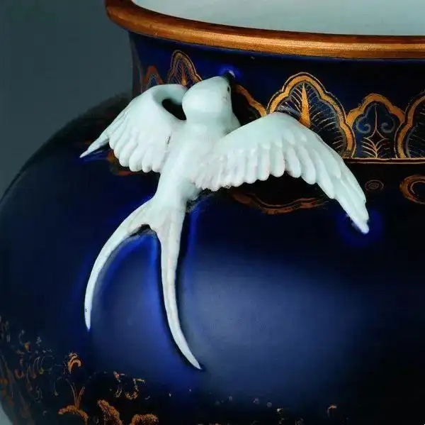 这件瓷尊高31.3厘米,口径25.1厘米,是为圆明园海晏堂特别烧制的陈设品。敞口、短颈、丰肩、鼓腹,腹部以下内敛,肩颈间雕贴一对白色展翅剪尾燕子作为耳饰。