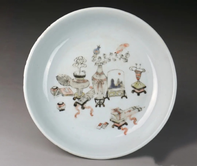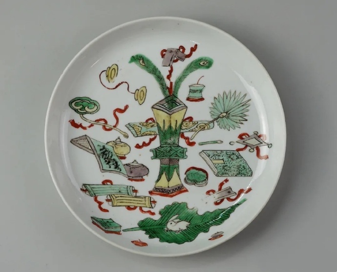 又如图2的清康熙五彩博古纹盘,画片正中是一件铜出戟方觚,觚腹饰云雷纹,上下环饰蕉叶纹,口内插有孔雀翎毛;觚后侧绘古琴;左侧绘如意、棋盘棋缸及书画;右侧绘羽扇、毛笔、书籍;下侧绘蕉叶白兔;画片空隙处点缀吉磬、方胜等杂宝。