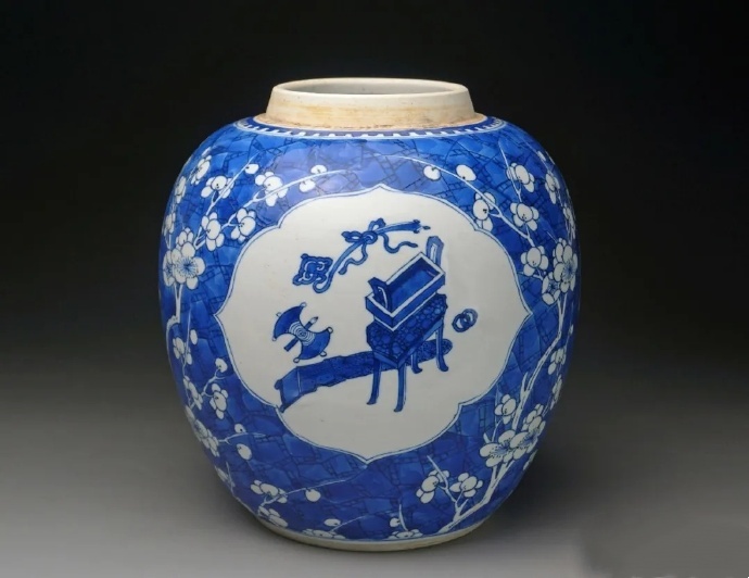 开光装饰在康熙瓷中较多见,而博古纹和冰梅纹的结合是这时期的一大特征。如图3的清康熙青花冰梅开光博古纹罐,冰梅地三开光,开光内绘毛笔、金锭、如意,谐音“必定如意”,亦有围棋、古琴、书画,寓意“书香门第”。此器青花发色明艳,呈“翠毛蓝”,所用青料是典型的浙料。浙料产自浙江绍兴、金华一带。明万历朝中期以后,由于回青料断绝,景德镇青花瓷器改用浙料,直至清嘉庆朝。道光朝开始,浙料告急,逐步改用珠明料。