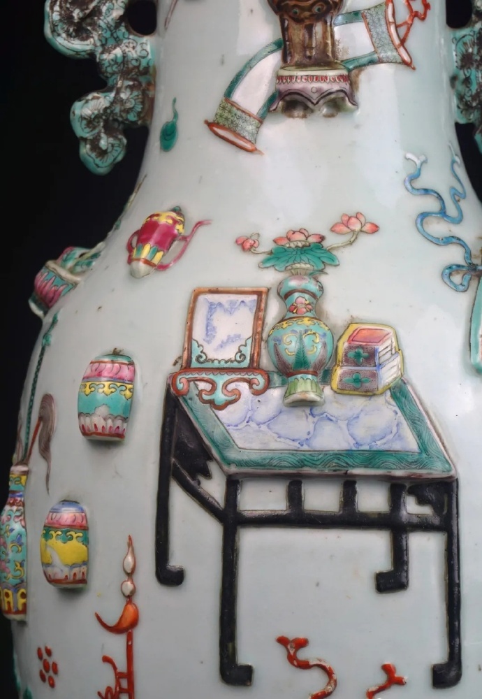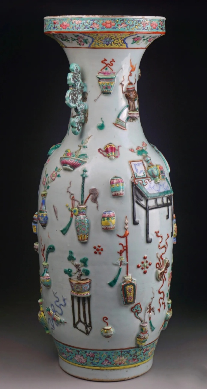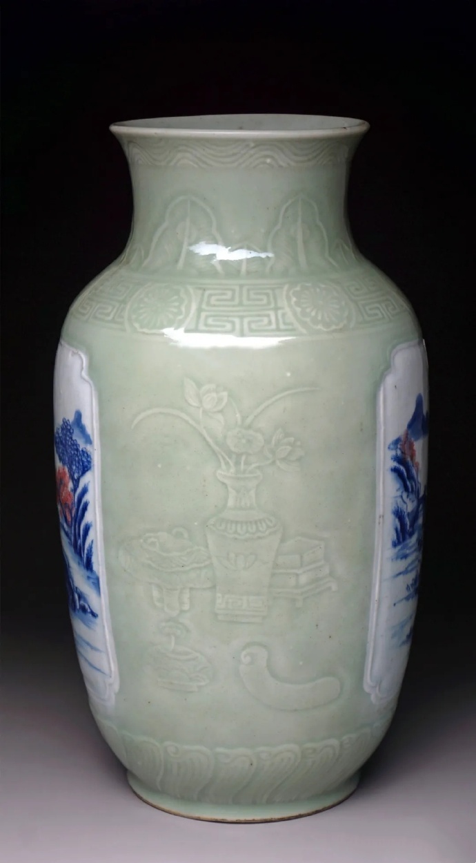 清康熙朝,是博古纹在瓷器上运用的鼎盛期,釉彩品种有青花、五彩、斗彩、素三彩、矾红彩、金彩等,器型包罗万象,纹饰内容丰富,多有吉祥寓意。