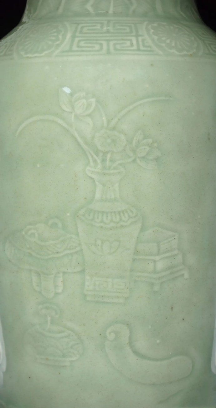 博古纹 是汉族传统装饰纹样的一种,以北宋大关时期的《宣和博古图》 为蓝本演变而成。后人因将图绘瓷、铜、玉、石等各种古器物的画,叫做"博古"。也有添加花卉、果品作为点缀的。瓷器上常用这种题材作为装饰图案,为博古纹,在明末清初应用较多,寓意清雅高洁。