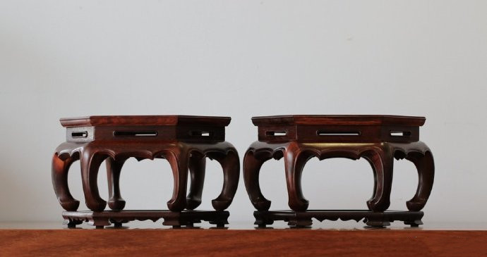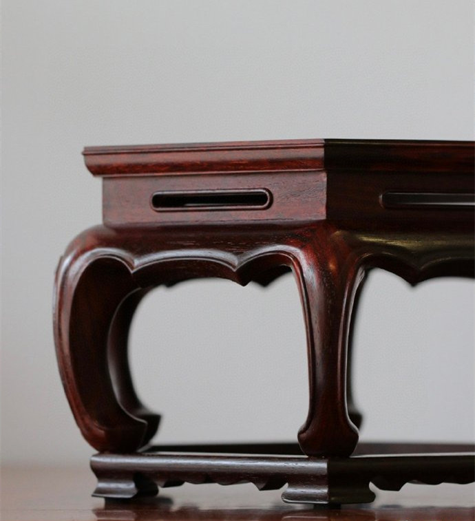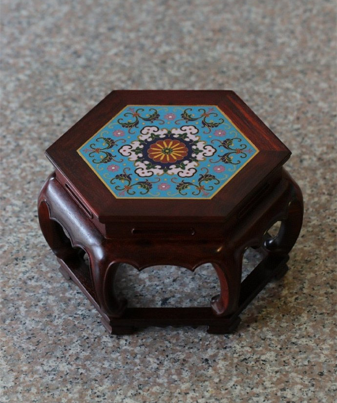 造型简洁素雅,面板六面攒边,嵌纯手工紫铜胎景泰蓝面板。榫卯严密,线条顺畅。可承托瓷器,盆景和香炉等,为屋添趣。22.8*20.8*13.8cm高