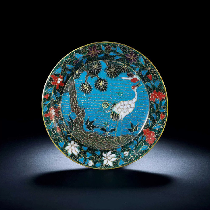 此盘胎体厚重,器型规整,珐琅釉色艳丽纯正,釉质温泽,纹饰经典,疏朗有致,做工精细,线条流畅,寓意吉祥,借苍松仙鹤转喻长寿延年之美好祝愿,设计巧妙。墨绿色及紫色晶莹亮泽,鲜艳明快,呈半透明状,具有宝石般晶莹深邃之感,此乃显著的元代掐丝珐琅作品之特征。明中期类似画片的器物可见于《Chinesisches Cloisonné The Pierre Uldry Collection》(皮埃尔.乌德瑞收藏中国景泰蓝),1985年,编号50及52。