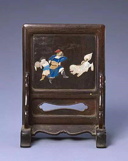 插屏紫檀木质,由屏心、站牙、抱鼓墩组成。屏心两面皆在紫檀木上以螺钿、青金石、椰壳等为原料镶嵌图案,一面为梅花图,一面为番人戏狮图。绦环板处开菱形透孔,壸门式披水牙子,如意头式抱鼓墩。 此插屏小巧玲珑,做工精湛,装饰华美,是一件精美的明式家具。