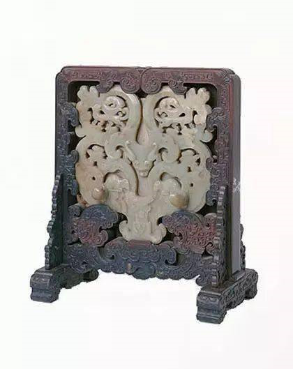 紫檀嵌青玉雕夔龙纹插屏,高36cm,宽31cm,厚17cm。清宫旧藏