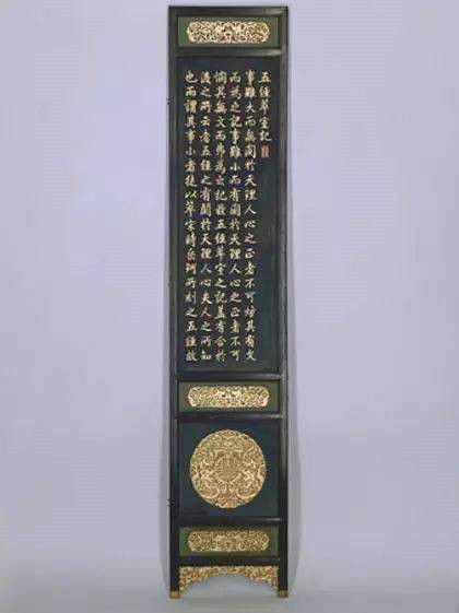 此围屏以紫檀木作框,屏心双面髹漆。五条横抹,裙板正中镶圆浮雕双螭拱寿纹。裙板上下和壸门式牙条上分别浮雕双螭拱寿纹和双螭纹。屏心为清乾隆帝御制《五经萃室记》全文。图文用金丝楠木锼刻,并采用周制镶嵌法,表面再施以泥金工艺。全文地子部分采用呈磁青色的青金石碎屑,雕刻部位地子采用呈石绿色的绿松石粉末,用特殊的漆饰工艺铺洒而成。整个屏风装饰庄重典雅,图文丰满,别具一格。