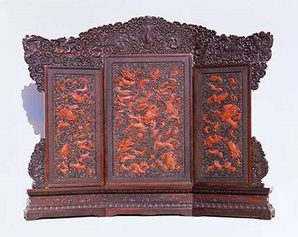 屏心用黄杨木雕龙纹,与紫檀木所雕云纹地形成色差,使云龙表现得更加生动。其位置用于宝座之后。此屏风出自宫廷造办处,做工极精,堪称乾隆朝的家具精品。