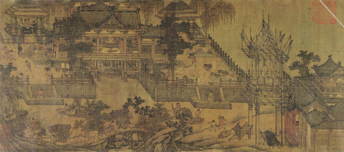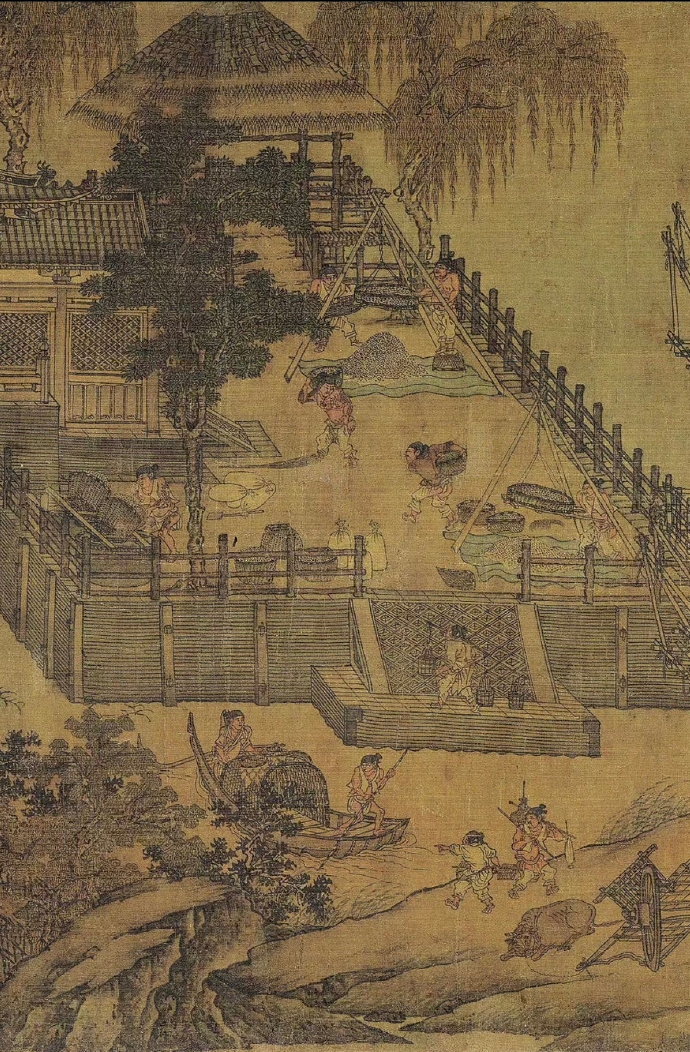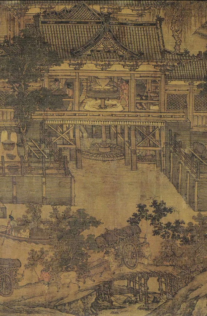 此卷以“航拍”视角描绘了古代粮食加工的过程。水流推动磨盘运转,农夫们或磨面或赶车,岸上有运送面粉的马车,河里有运送货物的船,整幅画似一个分工明确、水陆并用的半自动化粮食加工线,是研究宋代山水、建筑、机械、水利、舟船、服饰的重要资料。