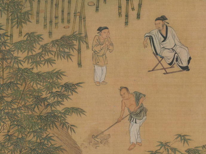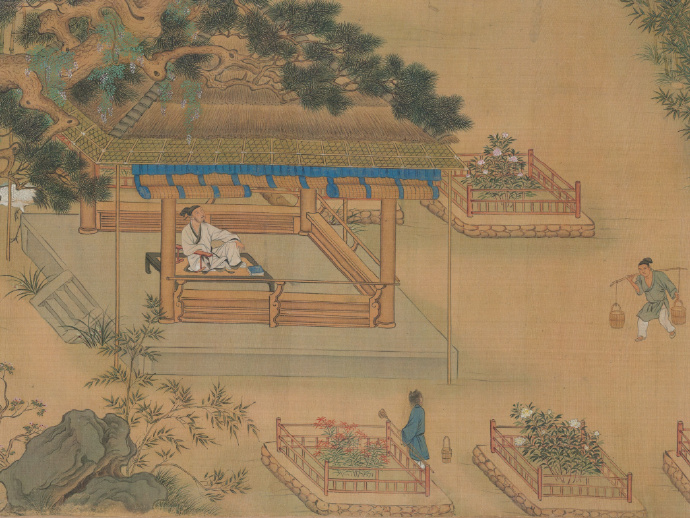 《独乐园图》描绘了北宋名臣司马光的私人园林"独乐园",依次呈现了弄水轩、读书堂、钓鱼庵、种竹斋、采药圃、浇花亭、见山台等七处景致。园中人物活动丰富,如司马光倚坐榻上、童仆浇花施肥等,展现了园主的园居生活。