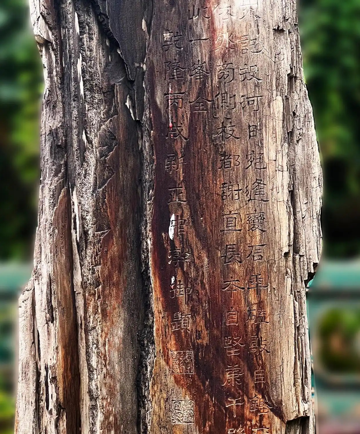 绛雪轩(位于御花园东南部)前的庭院内,有一块木变石。该石高约1.3米,宽约0.18米,坐落在高约1.1米的圆盆形石座上。其外观类似于被切开的树干,正面平整,背面呈弧形。石材表面纹理清晰,与周边细小的斑片巧妙地融合为一个整体。这块木变石是清代时,黑龙江将军富僧阿进献给乾隆帝的礼物。乾隆帝命人将其放在御花园,并于乾隆三十一年(1766)正月,在石块正立面刻诗:“不记投河日,宛逢变石年。磕敲自铿尔,节理尚依然。旁侧枝都谢,直长本自坚。康干虽岁贡,逊此一峰全。”乾隆帝在诗中特地说明:吐鲁番、哈密等地的官员几乎每年都要进贡木变石,但是每块木变石的尺寸很小(不足一尺),只能当磨刀石;但这块木变石不一样,不仅尺寸长、体形大,而且表面尚有清晰木纹,敲之又发出铿锵有力的声音,因而是一块难得的木变石。