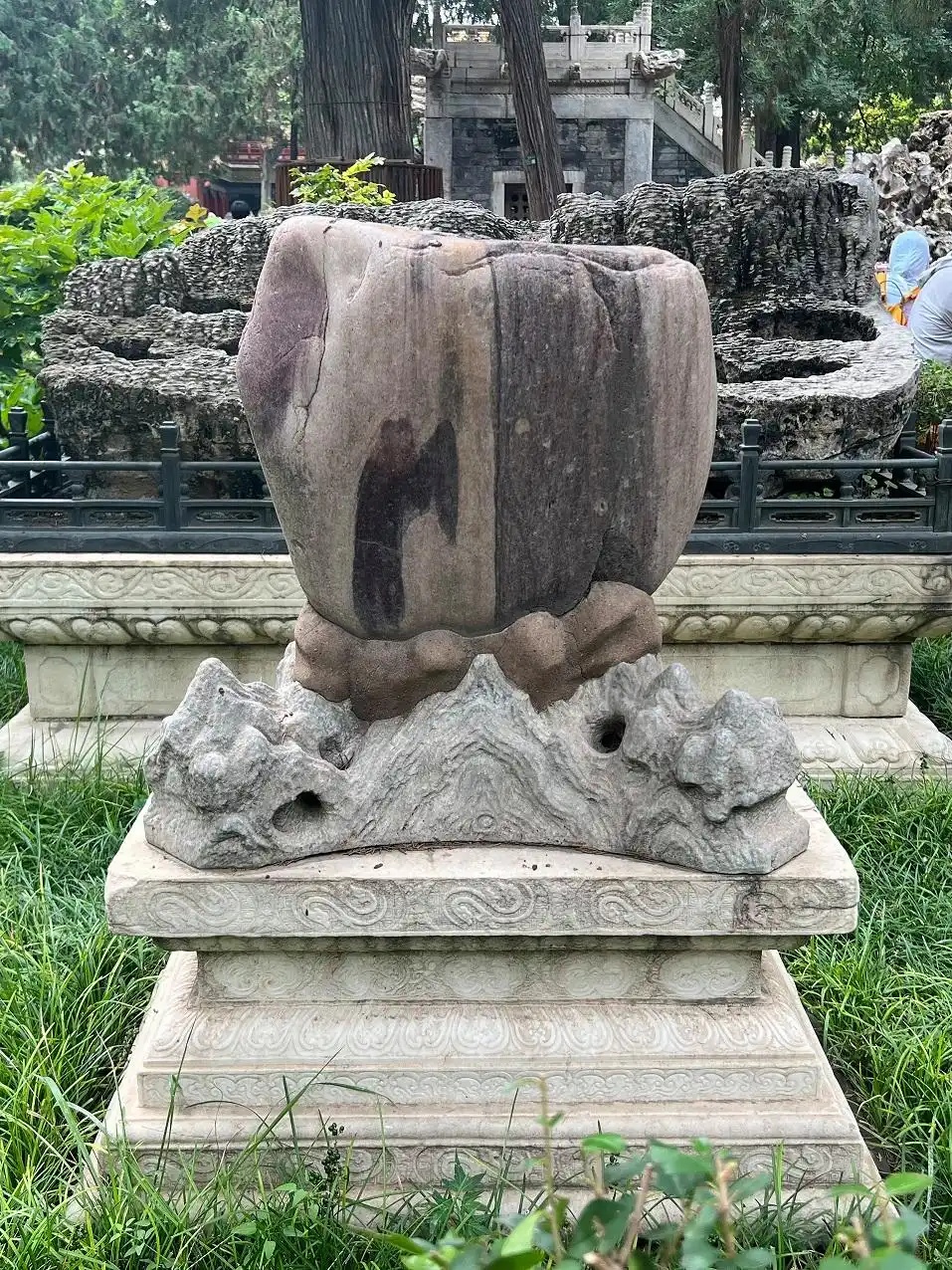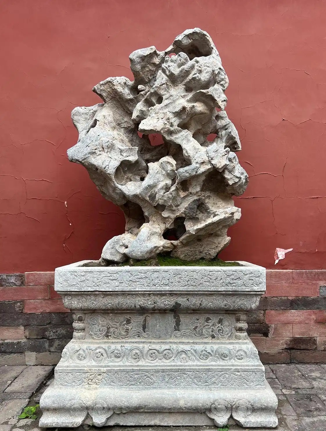 琼苑西门位于御花园的西南角,是西六宫夹道通向御花园的入口。琼苑西门靠近夹道的一侧,有一块太湖石。此太湖石体形硕大,高约1.6米,最宽处约1.2米,坐落在高约0.93米的长方形须弥座上。石头呈灰白色,左侧下部凹进,右侧端部近似竖直状。其造型符合“瘦、漏、皱、透”的特点。“瘦”是指石头体形纤瘦、富有曲线,“漏”是指石头玲珑剔透、涡洞相通,“皱”是指石头体态起伏,凸凹有变,“透”是指石头纹路直通、浑然天成。相应的,此石整体棱角分明,造型独特;孔洞遍布石身,尺寸较大,且多有贯通;各部位凸凹相间,犹如犬牙交错;石头尽管为风化形成,但表面纹理较为清晰,粉末状部位较少。而从人文意蕴角度而言,此石虽为自然形成,但坚硬的质地给人“古拙”之美,遒劲的形态赋以人阳刚之感,表面的“皱”又产生类似水波的视觉,给人以山水环绕、动静相宜的遐想。