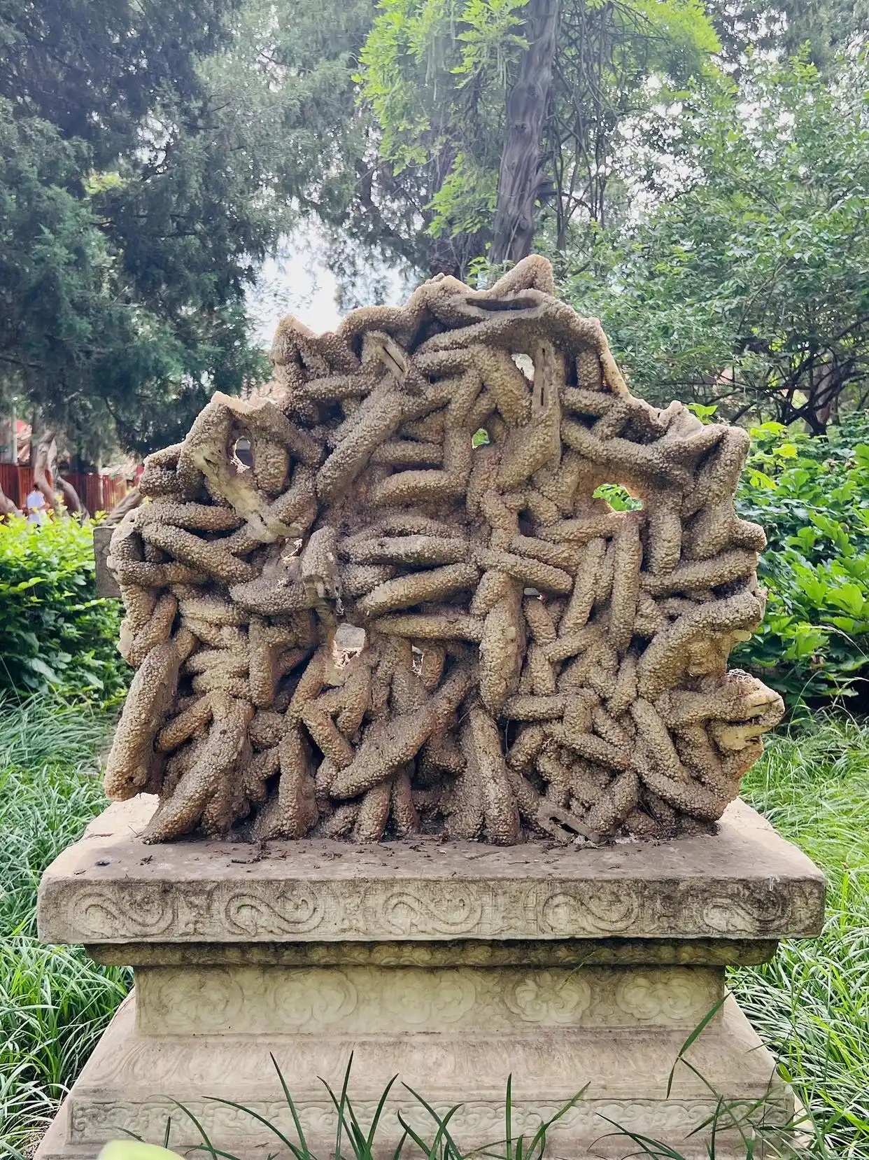 天一门前的庭院西侧,与纹理石相对的位置,有一块珊瑚石。由于其外观犹如成百上千条海参凝聚而成,因而又被称为“海参石”。此“海参石”高约0.65米,最宽处约0.75米,底部最厚处约0.15米,坐落在高约0.45米的长方形须弥座上。从单体外观看,每个珊瑚石的长度相近,体形均为中间粗、两端细并略带弯曲的管状物,且表面密布米粒大小的颗粒物,与海参的外形极其相似,不由令人感叹自然造物之奇妙。