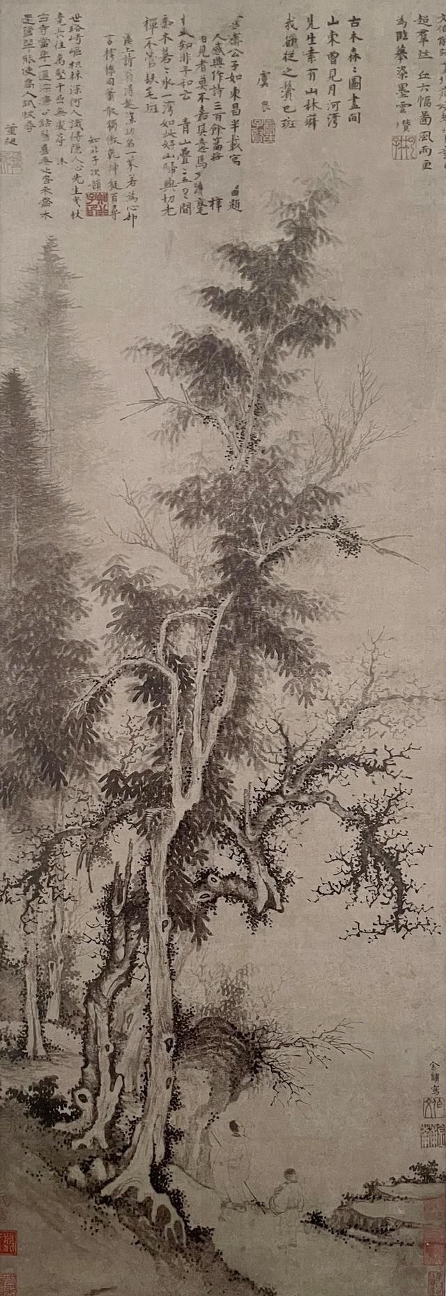 图中几株奇崛古木占据画幅大半,两个人物立于右下一隅。