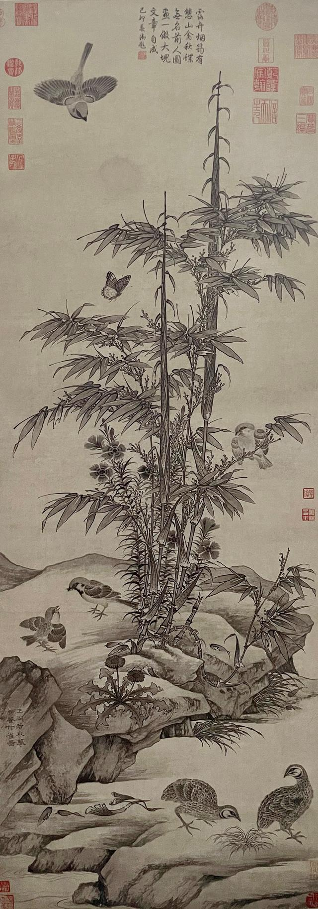 图中新篁、石竹之下的母子雀来源于五代西蜀黄筌的《写生珍禽图》,水岸边的鹌鹑、草丛则与王渊名作之一《秋景鹑雀图》中的鹌鹑和成丛的野草相似,整体展现出“前人图画一仿,大块文章自成”的创作方式,虽与王渊典型作品有差距,但反映出了王渊之水墨花鸟画风的广泛影响力。