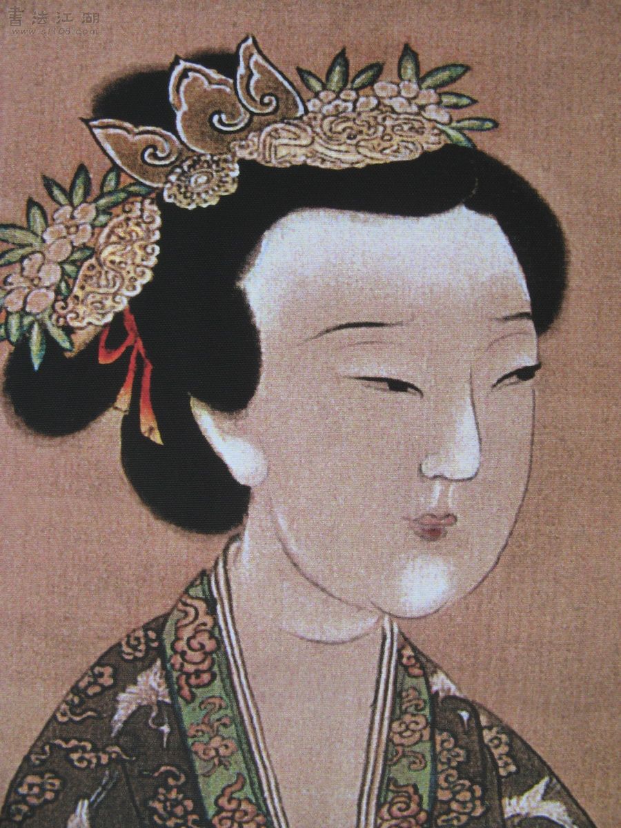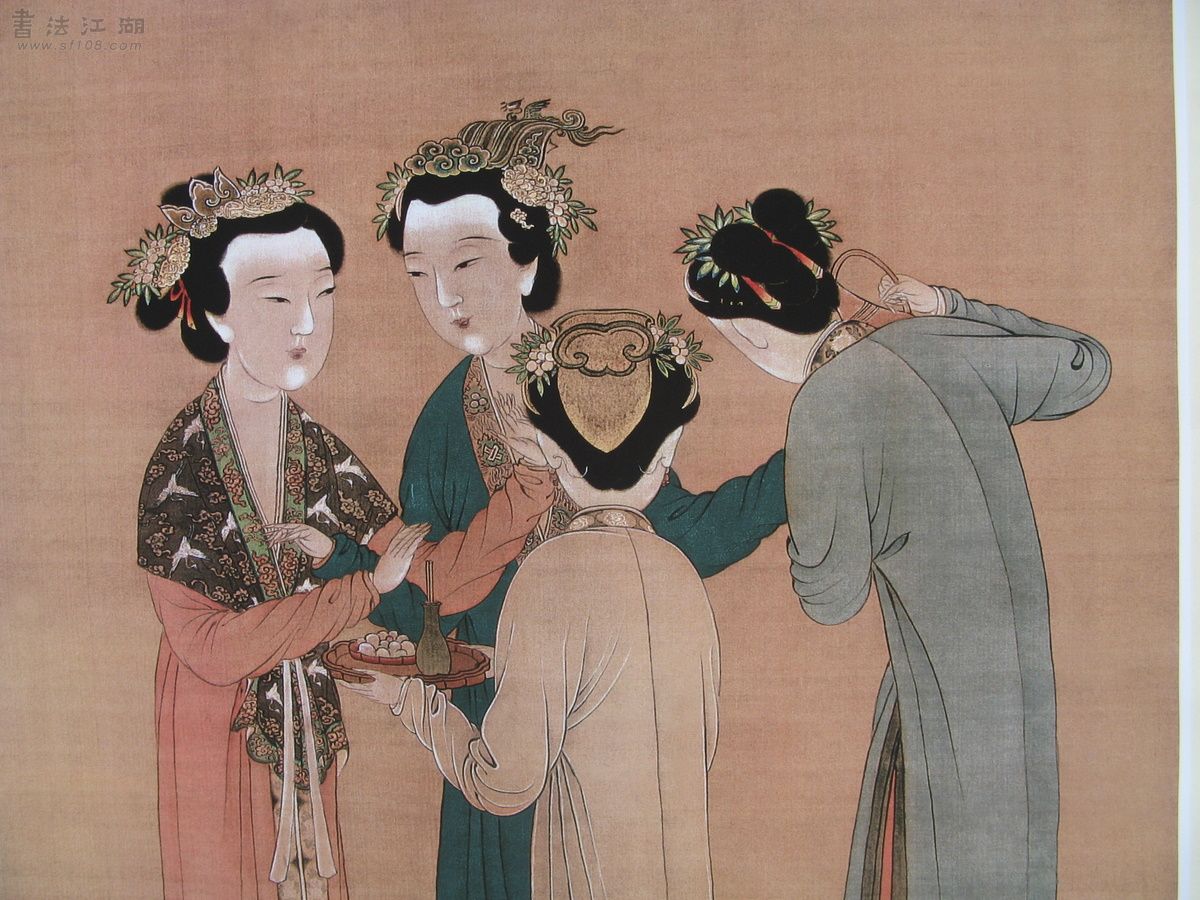 行笔秀劲缜密,有着潇洒清逸的气韵。以传统的工笔重彩的手法,以“三白法”染仕女的面部,突出了宫女的浓施艳抹。衣纹用细劲流畅的铁线描,服饰施以浓艳的色彩,显得绮罗绚烂。