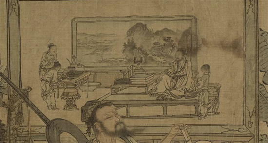 我们观察屏风画中的烹茶之器是莲花托座上的风炉,炉上放着一长柄铫子,可见屏风中此时的烹茶方式是煎茶。煎茶是将细研成末的茶投入滚水中煎煮,南唐入宋的徐铉在咏茶之作中言道“任道时新物,须依古法煎。”宋人虽时兴点茶法,但是煎茶被宋人赋予崇古的意味,而为士人所重,重在其古意,融于这幅消夏图中更是显现了宋元风雅文士尚古的精神世界。