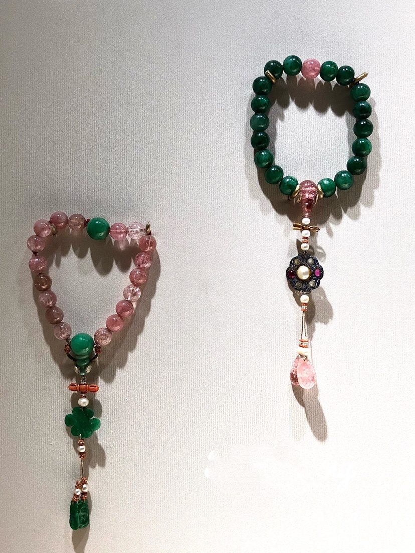 手串由18颗粉色碧玺珠穿成,间有翠质结珠两个,俗称“佛头”。其中一佛头下接佛塔一,系丝线及一珊瑚杵,下连翡翠盘肠背云,上下各系珍珠一,再下为果实形深绿色翠坠角两个,坠角上有小珍珠二。共有红白米珠10组。碧玺的颜色柔和清澈。此手串为十八子手串。十八子手串是由佛教念珠演化而成的一种饰物,可以佩带于衣服上、挽在手腕上或闲暇时把玩,由18颗珠子组成,故而得名。其材质一般为翡翠、珍珠、碧玺、蜜蜡、珊瑚、伽楠木等。
