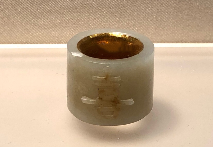 “扳指,古称韘,是扣弓弦的器具,套于拇指之上,防止拉弓时勒伤手。扳指在清代盛行,并逐渐演变成豪官显贵手上的一种装饰品。扳指最初多用骨或象牙雕制,清代的原料多选用玉、翡翠或金银,有的还饰有纹饰和镌刻诗句。