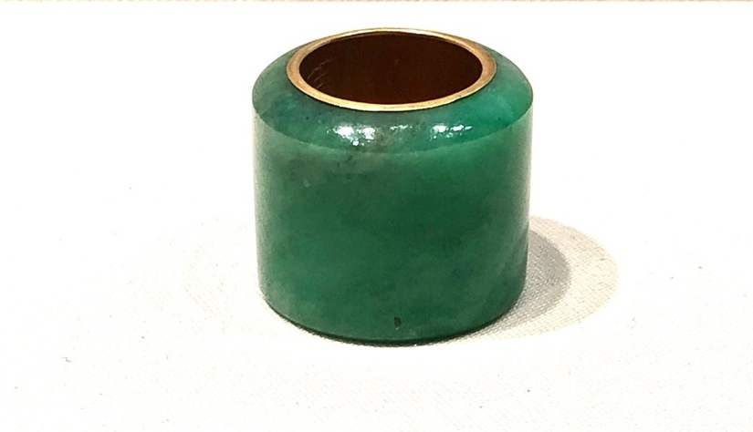 “翠镶金里扳指,清,径3.2厘米,高2.5厘米。