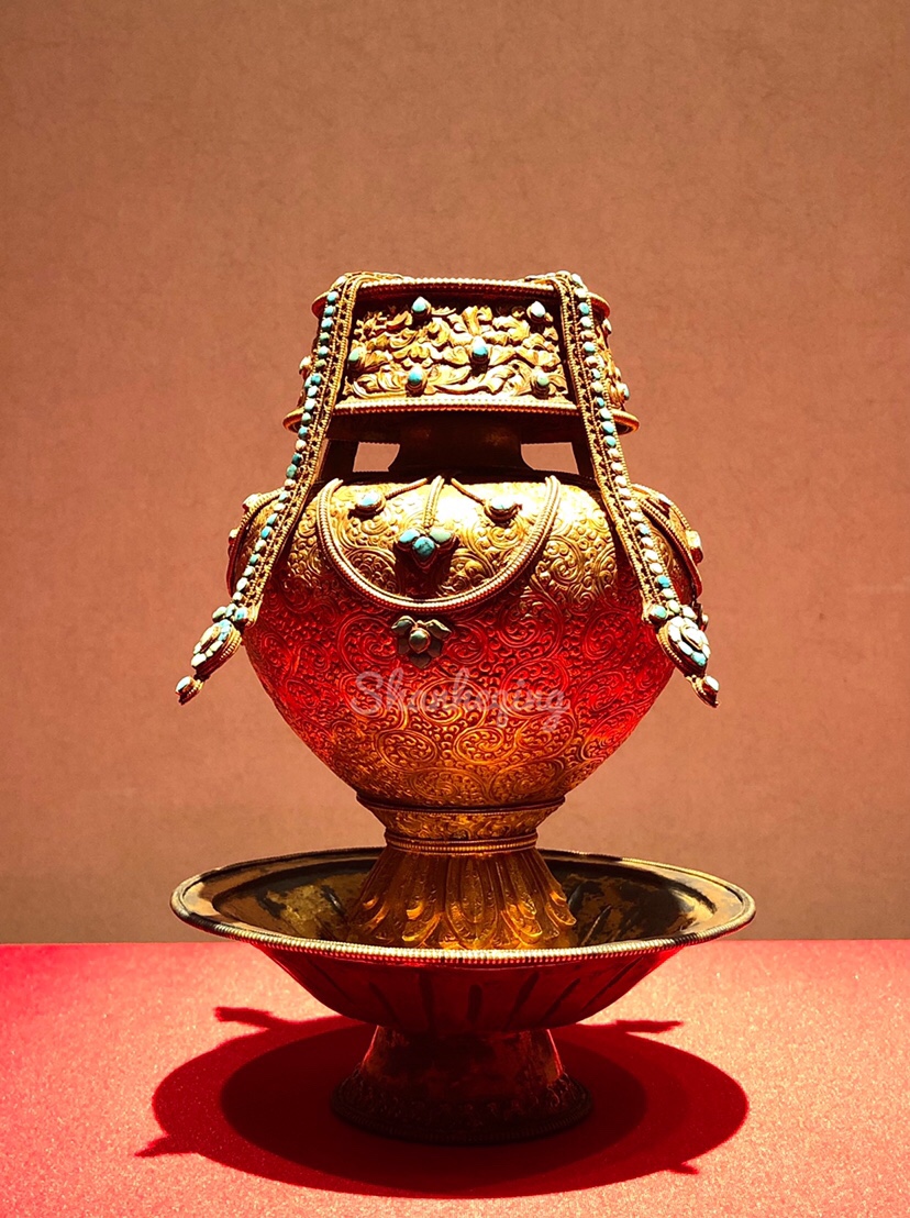 此种形式的瓶是藏传佛教中非常典型的供器。在密教仪式举行过程中,此种瓶往往供奉在高大的佛、本尊的供桌前,瓶中插着吉祥草或孔雀翎,下面的盏中盛放谷物,作为供神和举行仪式中不可缺少的法物。”