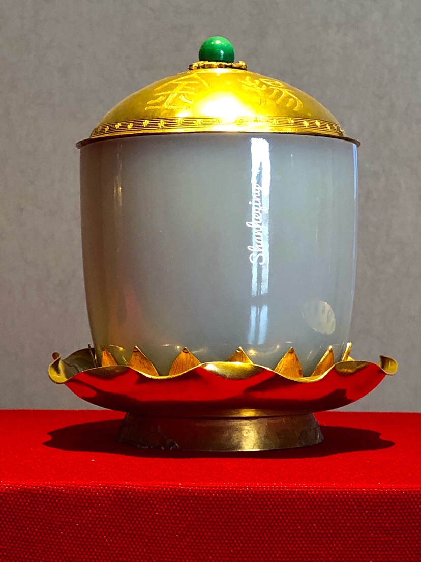 此金盖杯材质对比强烈,内敛含蓄的润玉与奢华的黄金结合在一起分外抢眼。盖、杯、托盘的装饰从上至下由繁复到简单复又繁复,并以艳色盖钮作点缀,颇具韵致,整体给人以精致、大气的印象。”