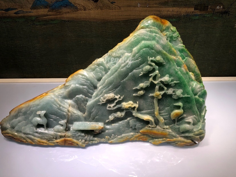 上图为:翠雕鹤鹿人物图山子;
