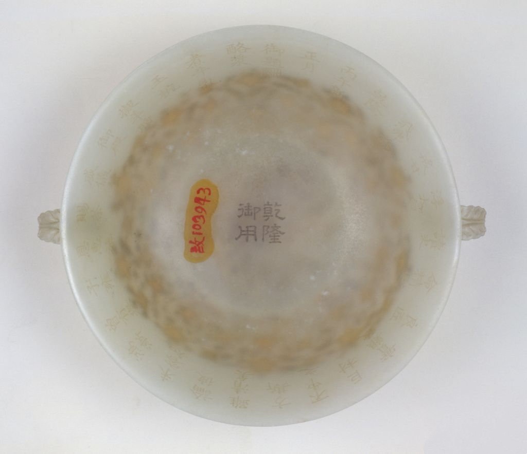 并有“乾隆丙午新正月”“御题”款识及“比德”印。碗内底正中有隶书“乾隆御用”四字。