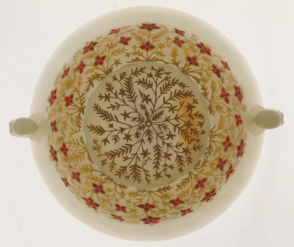 艺术作品的风格与制作者的审美取向相关,在白如凝脂的玉上错以黄金,镶嵌红色宝石,显得格外豪华富丽。本器具有典型的痕都斯坦风格,通过器物外在的华美,体现出西部民族热情奔放的性格特色。正因此碗具有独特的艺术神韵且制作功力精湛,所以自乾隆五十一年(1786年)制成后始终为乾隆皇帝所珍爱,甚至在庆典活动时还被当作御殿赐茶的用具。