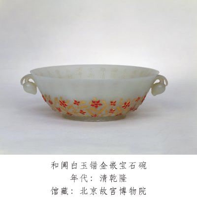 碗玉质莹白。器壁薄,横截面为圆形,由口及腹斜收,桃形双耳,花瓣式圈足。腹外壁饰花叶纹,独具特色的是枝叶由金片嵌饰而成,花朵则以108颗精琢的红宝石组成。腹内壁有阴文楷书乾隆帝御制诗一首,全文为: