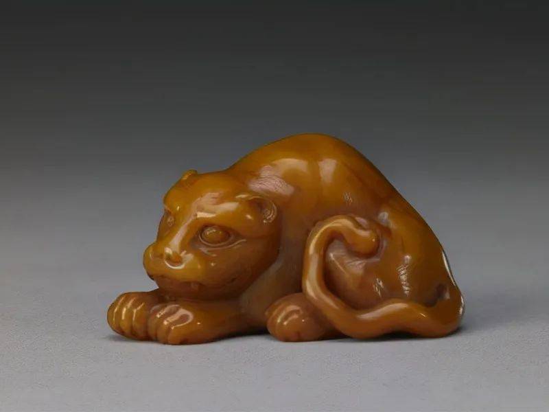 田黄石卧虎,清,杨玉璇雕刻,通高3.6cm,长6.7cm,宽3.5cm。