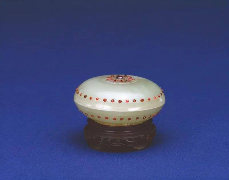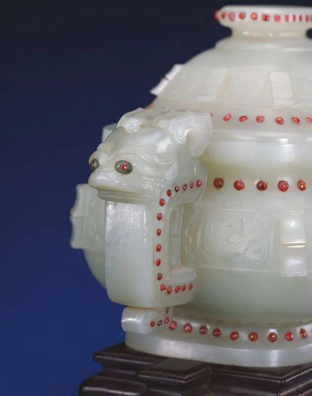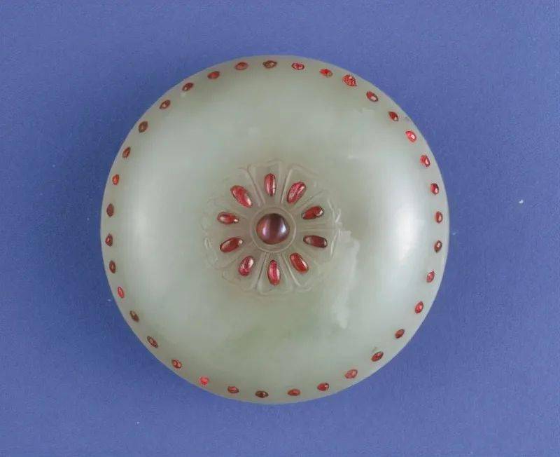 故宫博物院收藏的“三式”质地很多,而在青玉上嵌红宝石唯此一套。在青白色的玉石上镶嵌着颗颗鲜红色的宝石,尽显华丽与富贵。