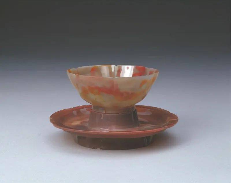 玛瑙葵花式托碗,清乾隆,碗高4.7cm,口径11.3cm,足径5.4cm,盘高2.7cm,口径16cm,足径9.7cm。
